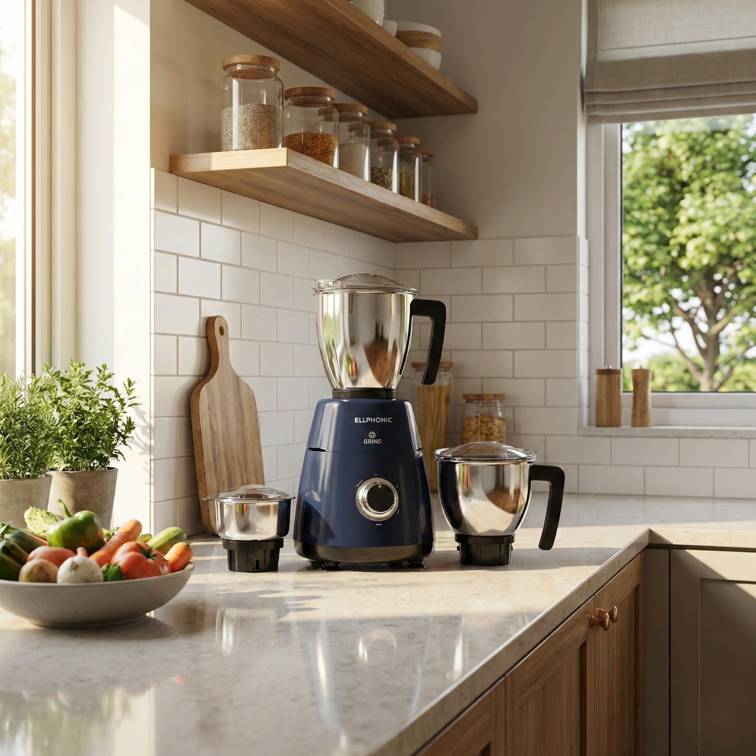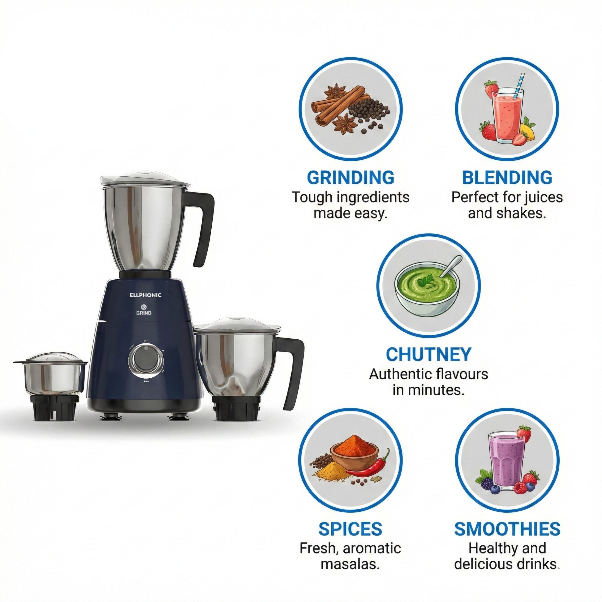 ELLPHONIC Grind 750W Mixer Grinder with 3 Jars | Multipurpose Jars – 3 Stainless Steel | Heavy Duty Motor | 2 Years Manufacturer Warranty | Ink Blue